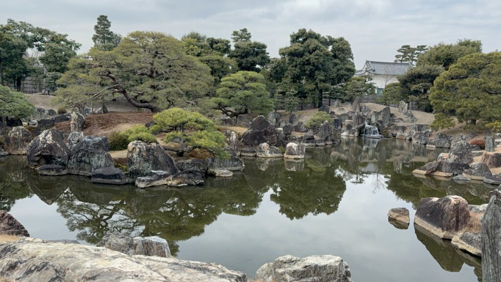 The region’s contemplative side emerges in its renowned gardens and imperial sites. A photograph captures a classic Japanese garden landscape: a still pond reflecting twisted pine trees, moss-covered rocks, and distant architecture, with a small waterfall adding gentle motion. The scene evokes perfect balance and restraint, where every stone and tree is placed with intention to inspire meditation and harmony with nature. This Zen-like serenity—seen in places like the gardens of Kyoto’s historic temples—stands in direct opposition to the lively, almost overwhelming paths of Fushimi Inari. While one invites endless movement and ascent, the other demands stillness and reflection, highlighting Kansai’s ability to offer both spiritual exhilaration and profound calm within short distances.