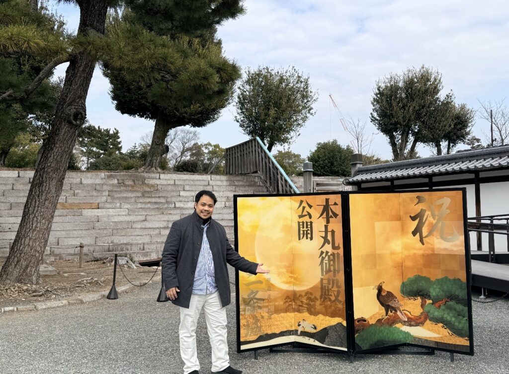 Further glimpses show the imperial heritage: a person posing proudly in front of a large folding screen adorned with traditional motifs of a full moon, hawks, and pine trees, set against stone steps and winter-bare branches. This evokes the grandeur of Kyoto’s Imperial Palace or related sites, where history feels tangible in architecture and seasonal displays. Another image places the traveler on a high vantage point, overlooking a valley with bare trees and distant rooftops under overcast skies, a sign warning of danger adding a modern, practical note to the scenic overlook. These moments blend personal presence with the weight of centuries, showing how Kansai invites visitors not just to observe but to stand within its layers of time.