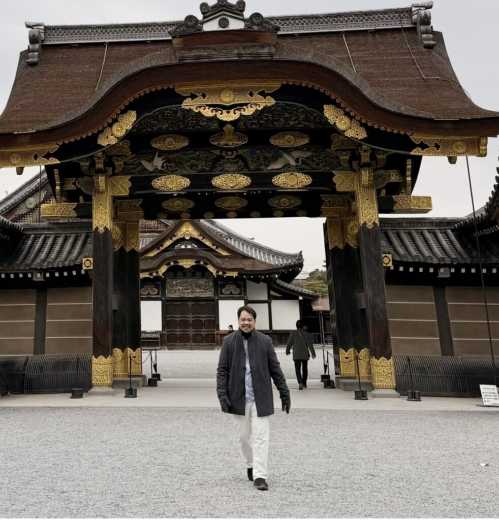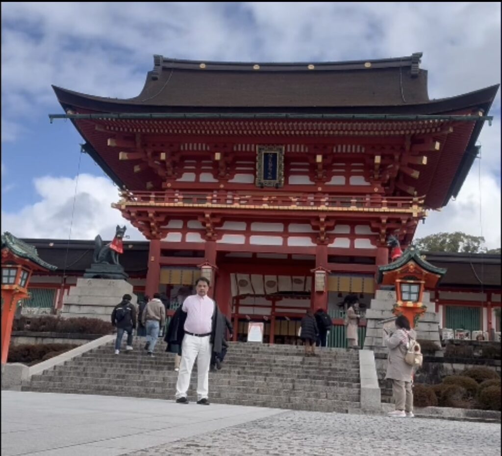 One of the most striking embodiment of Kansai’s vibrant spiritual side is Fushimi Inari Taisha in southern Kyoto. The shrine’s entrance features a grand red torii gate, its curved roof and intricate wooden details framed against a partly cloudy sky. A statue of a fox—messenger of Inari, the deity of rice, prosperity, and business—stands sentinel with a red bib, adding a touch of whimsy and folklore to the scene. The visitor stands confidently at the base of the stairs, blending modern attire with the ancient architecture. Another image shows the famous Senbon Torii, the thousands of vermilion gates forming a tunnel up Mount Inari. The bright orange pillars, inscribed with donor names and dates, create a rhythmic, almost hypnotic pathway through the forest. Walking beneath them feels like stepping into a living symbol of devotion and ambition—each gate a gift from those seeking blessings, turning personal aspirations into a collective, colorful spectacle. This vibrant, crowded, and energetic experience contrasts sharply with the quieter, more introspective aspects of Kyoto.